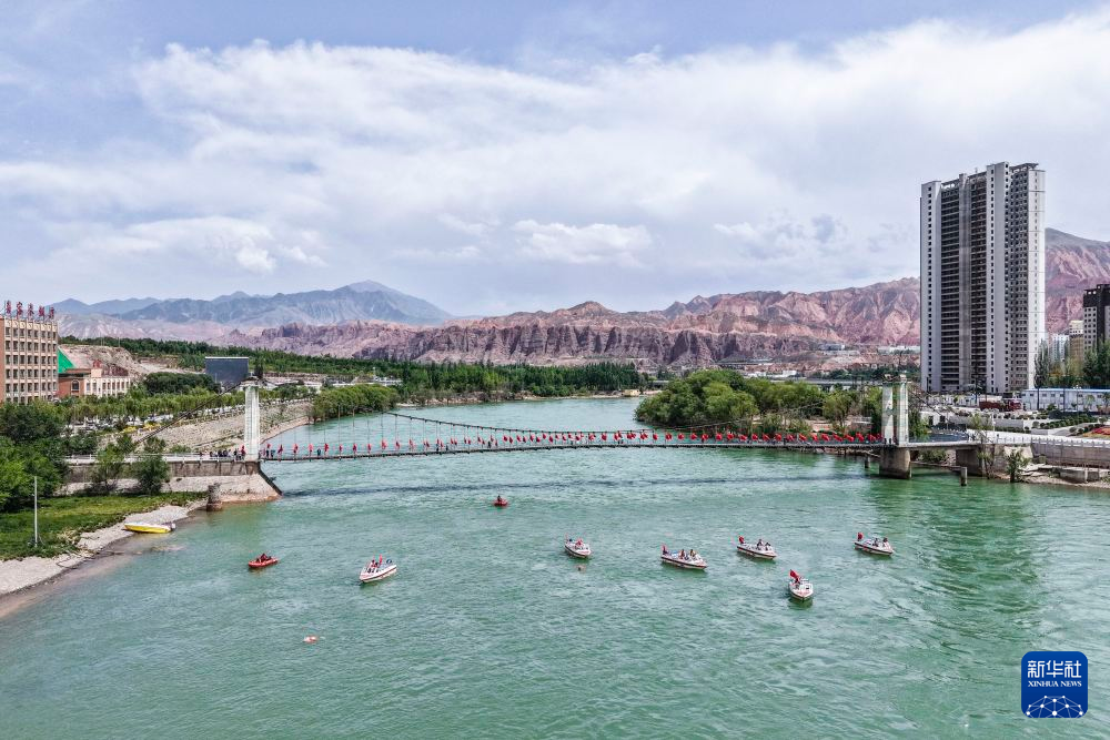 这是6月13日拍摄的第十九届中国·青海国际抢渡黄河极限挑战赛循化站赛场(无人机照片)。新华社记者 齐芷玥 摄