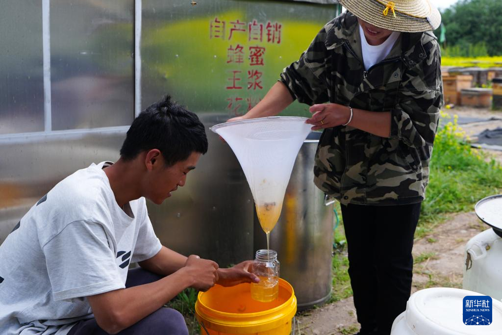 7月16日,在青海省海北藏族自治州门源回族自治县,廖春容与吴昊过滤新鲜蜂蜜。新华社记者 齐芷玥 摄
