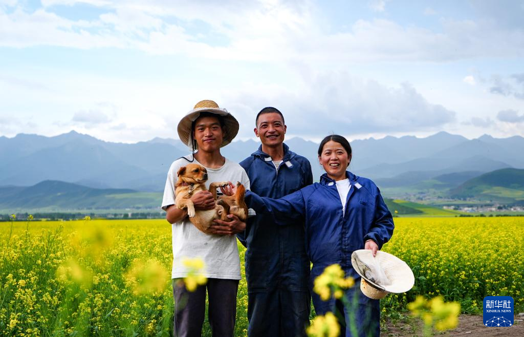 这是摄于青海省海北藏族自治州门源回族自治县花田的吴凤明一家(7月16日摄)。新华社记者 齐芷玥 摄
