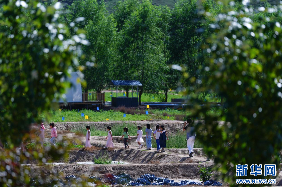 8月12日,小朋友在循化县布尔塘山区体验田园采摘。新华社记者 张龙 摄