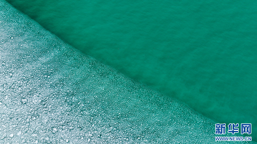 航拍青海湖半湖碎冰半湖水。新华网发(薛蒂 摄)
